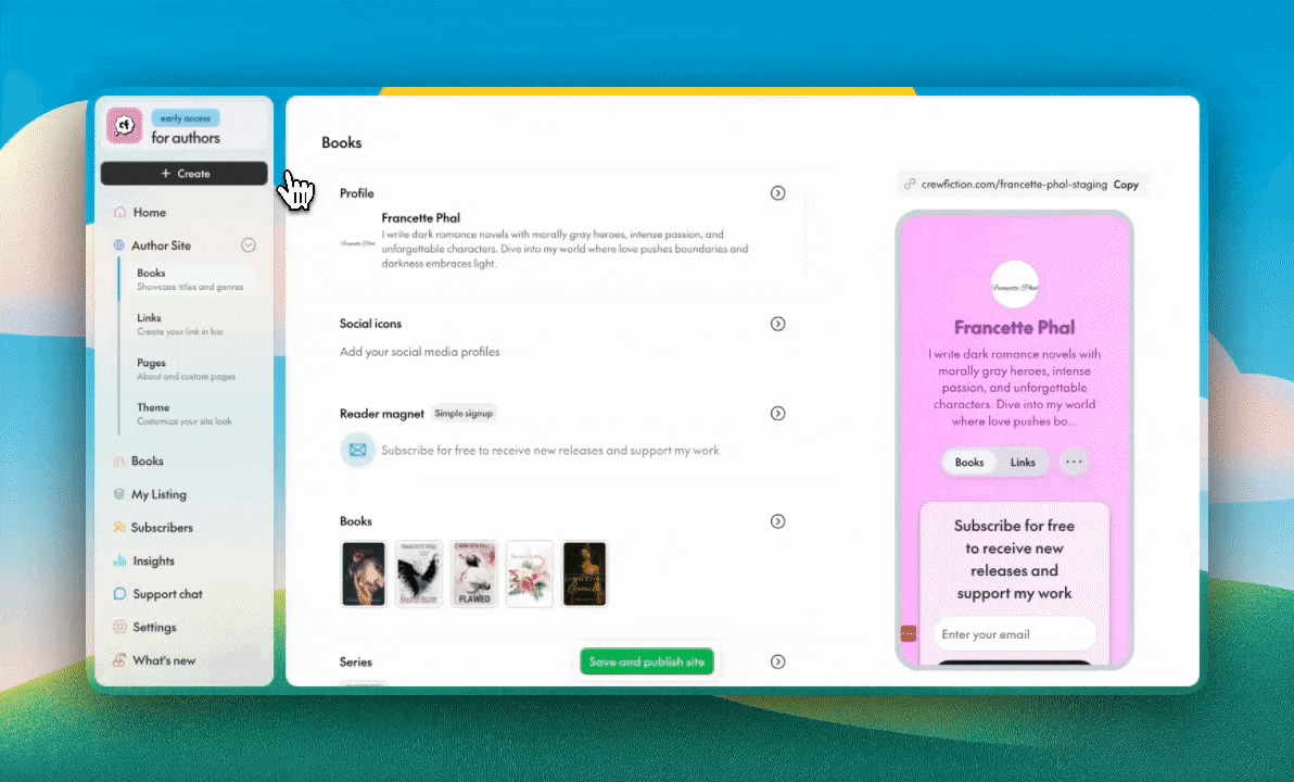 Crewfiction was the answer I needed! I wanted to simplify my website to something I could manage on my own and not pay for services that didn't fit my author business. I not only wound up with the website I wanted, but a slew of other things that make my work smoother and easier—all in one place. I'm excited to grow with Crewfiction.